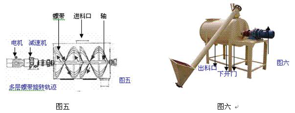 該機采用臥式筒體(圖五),單軸連起內(nèi)外二至三層螺旋帶,可使生產(chǎn)原料向不同的方向充分混合,外層螺帶和筒體間距離極小,放料后殘留少,臥式機體下部設有 下開活動門,以便更換不同品種時清掃(圖六)。安裝方便,噪音小,混合效率高,適合各種膩子粉、外保溫砂漿等粉體干混料的生產(chǎn),而且價格低廉是小企業(yè)投資 較小的理想生產(chǎn)設備。