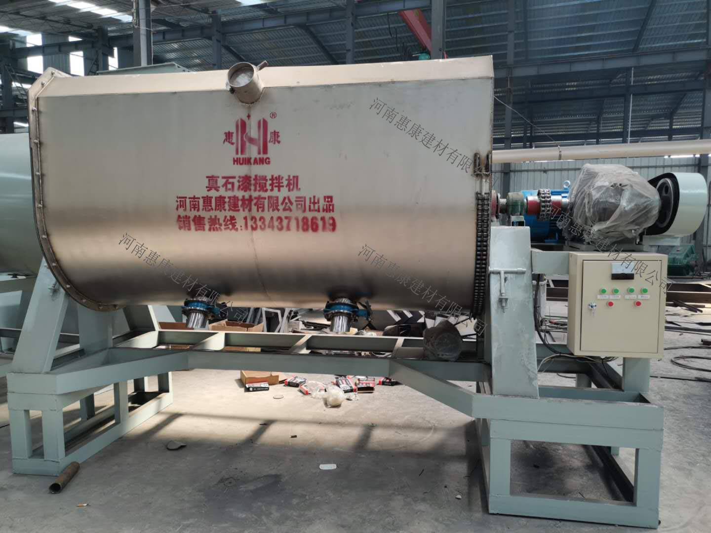 臥式不銹鋼內(nèi)襯真石漆攪拌機采用接觸物料為不銹鋼材質(zhì),大大節(jié)省了成本。U型可旋轉(zhuǎn)式設計,單批次攪拌量5-20噸,設備配置自動限位裝置,多限位開關,多重保障,極大的提高了設備運轉(zhuǎn)過程中的安全性。攪拌機采用內(nèi)外兩層螺帶,盤繞形式配合旋轉(zhuǎn)方向把物料從兩端向中間推動,而內(nèi)螺旋帶把物料從中間向兩端推動,形成對流混合,物料在相對短的時間混合均勻。